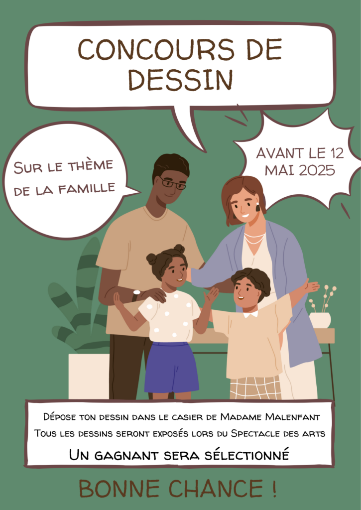 Les élèves souhaitant participer doivent me remettre leur dessin avant le 12 mai 2025, en le déposant dans le casier de Mme Malenfant avec leur nom, prénom et classe.