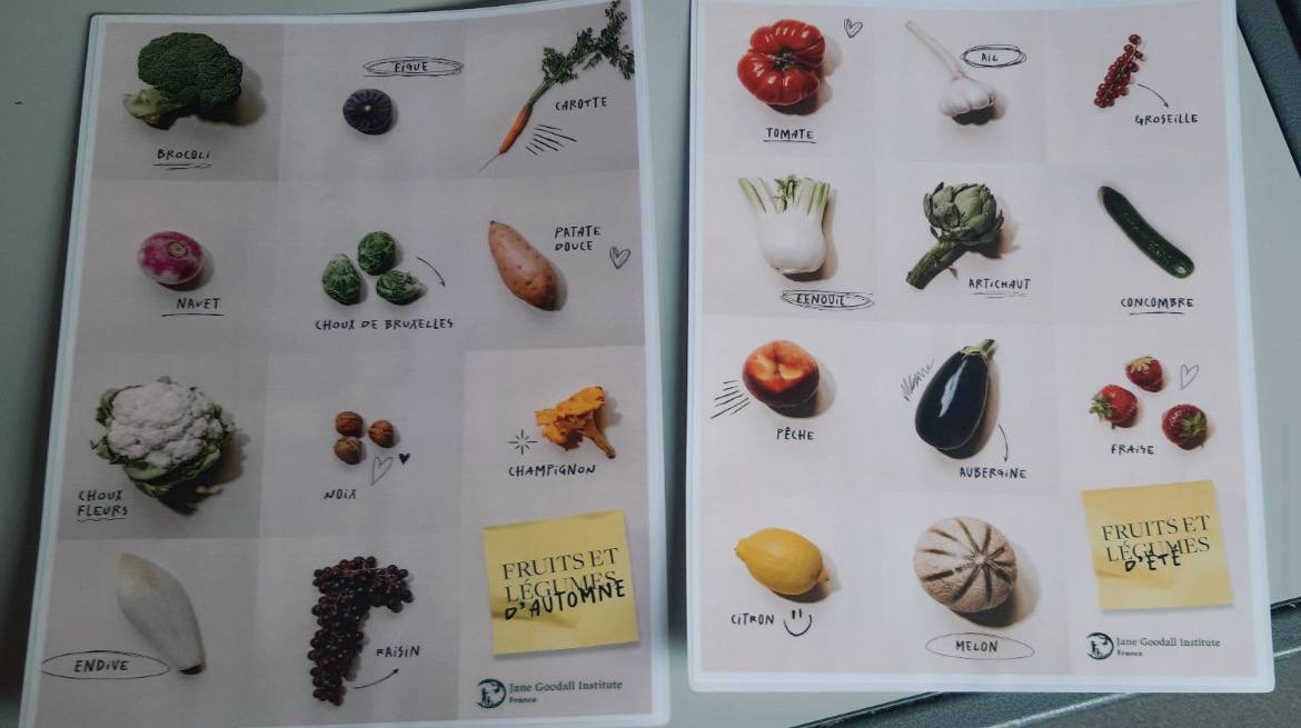 Durant la 2e partie de l’heure, les élèves devaient accrocher les affiches de fruits et légumes de saison (été et automne pour le moment) fournies par le Jane Goodall Institute.