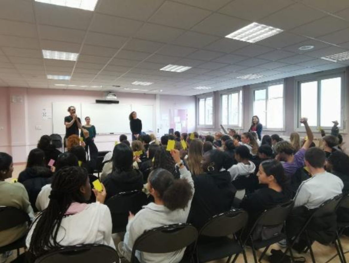 Pour ouvrir cette édition, les huit classes de 3e ont participé à une intervention de la compagnie Langue de Chat autour du respect des femmes, du consentement et des relations filles/garçons. À travers des saynètes et des échanges, les élèves ont été amenés à réfléchir à une idée essentielle : respecter l’autre dans ses envies, ses choix et ses limites.